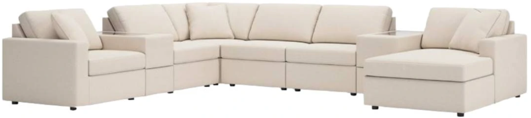 Comprend 8 éléments modulaires : fauteuil d'angle avec accoudoir gauche, 3 fauteuils sans accoudoirs, 2 consoles avec rangement, coin et chaise longue d'angle avec accoudoir droit.