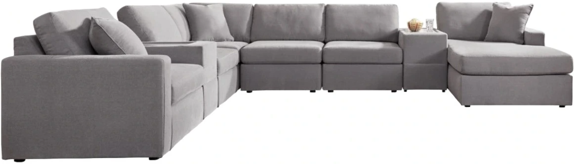 Comprend 8 éléments modulaires : fauteuil d'angle avec accoudoir gauche, 2 consoles avec rangement, 3 fauteuils sans accoudoirs, coin et chaise longue d'angle avec accoudoir droit.