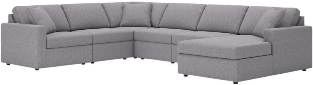 Comprend 6 éléments modulaires : fauteuil d'angle avec accoudoir gauche, 3 fauteuils sans accoudoirs, coin et chaise longue d'angle avec accoudoir droit.