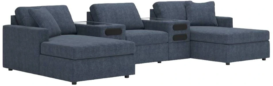 Comprend 5 éléments modulaires : méridienne d'angle avec accoudoir gauche, 2 consoles audio avec rangement, fauteuil sans accoudoirs et méridienne d'angle avec accoudoir droit.
