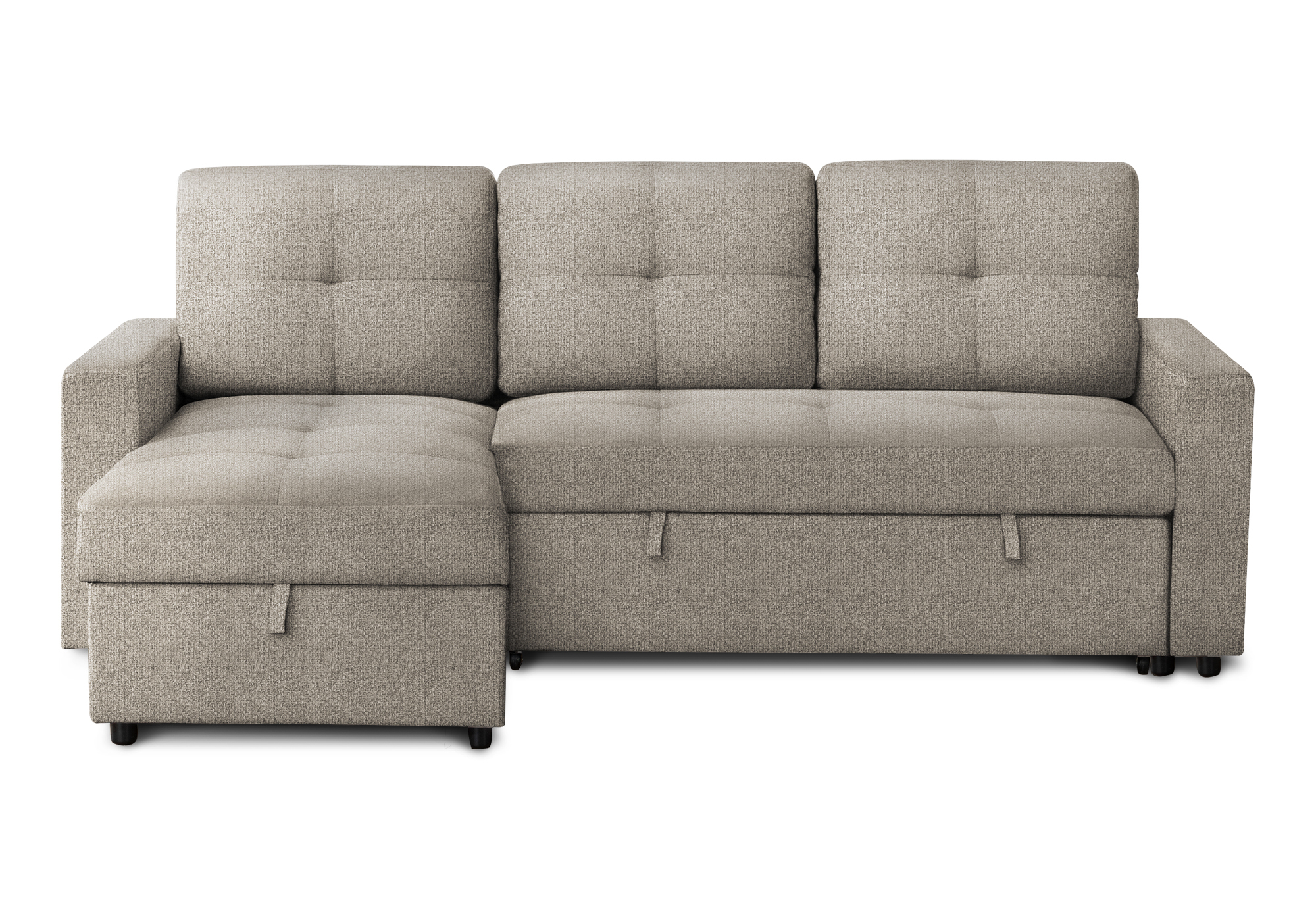 Ce canapé-lit 3 places transitionnel, au design capitonné sans boutons et doté d'une structure en contreplaqué solide, est recouvert d'un tissu brun clair doux et résistant sur une mousse haute densité qui s'harmonise parfaitement avec tous les styles de décoration