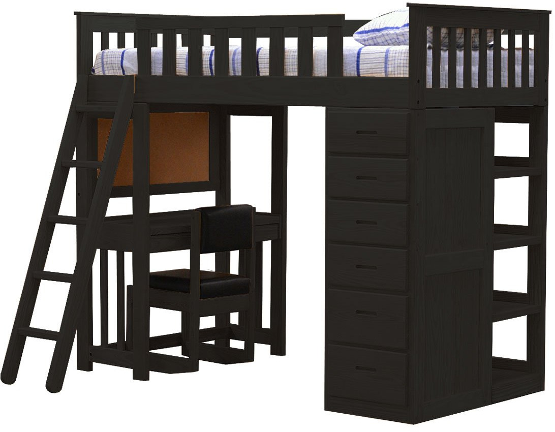 Les caractéristiques comprennent un dessus de bureau avec une finition laquée et un tiroir pleine largeur. Organisez-vous avec un dossier de bureau à 2 côtés - un tableau d'affichage en liège d'un côté et un tableau blanc de l'autre. Le panneau à 2 côtés s'inverse facilement pour profiter de la surface de votre choix. Rangez les vêtements dans la commode à 6 tiroirs avec deux tiroirs inférieurs extra profonds. Accédez à la bibliothèque à 4 étagères de l'intérieur et de l'extérieur. Un garde-corps arrière pleine longueur et un garde-corps avant sont inclus. Le dessus d'un matelas de 8 pouces d'épaisseur sera à 65 pouces du sol.